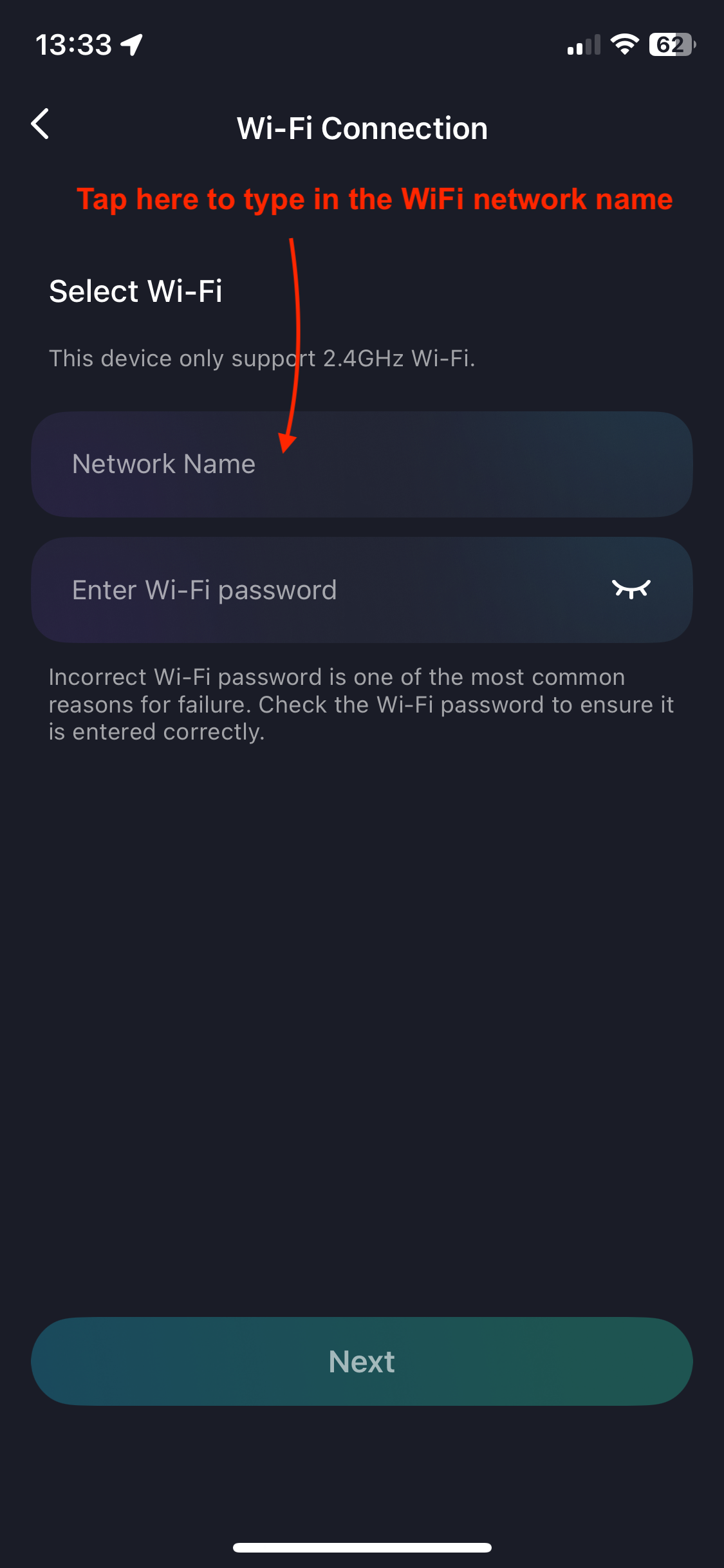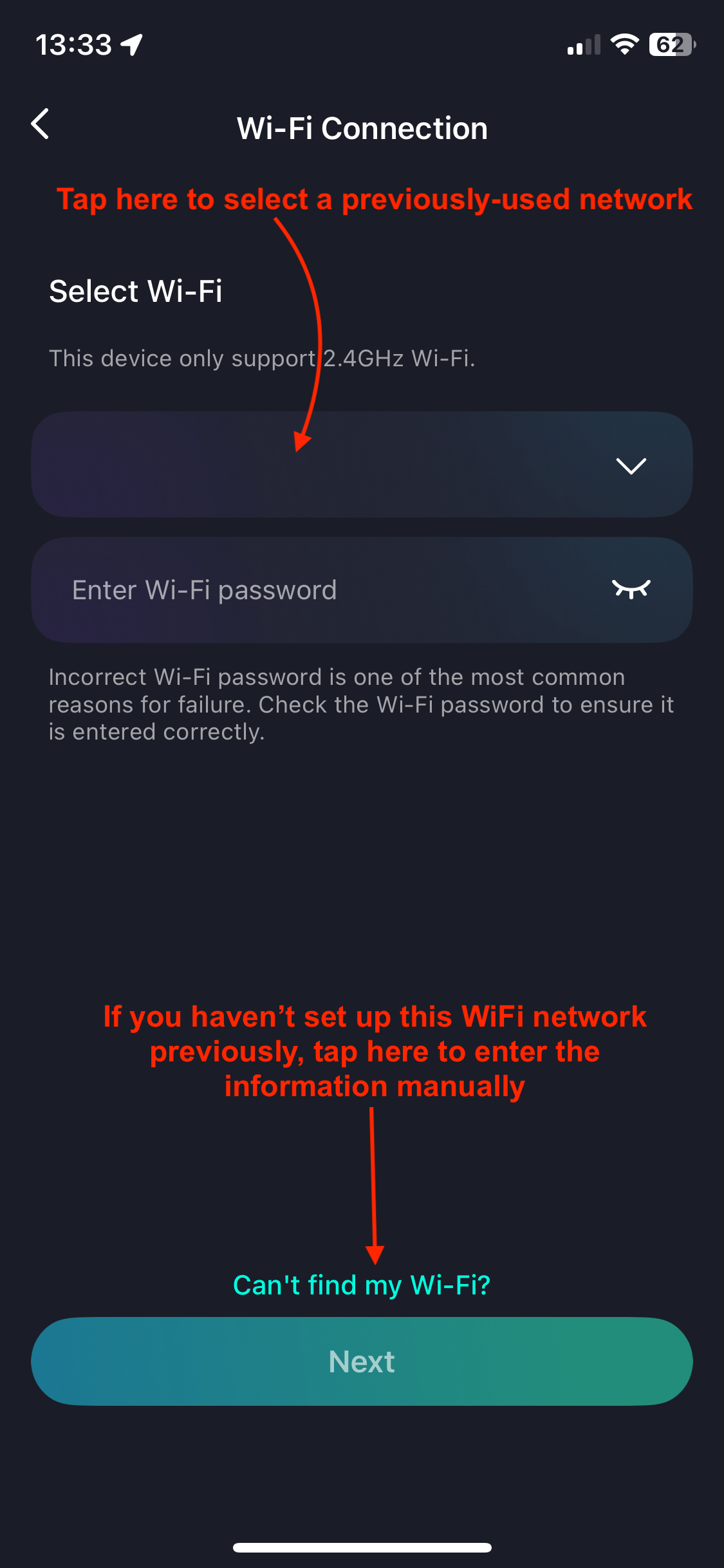 - The next screen will ask you to select a WiFi network. For the first time setting up, disregard this and tap "Can't find my Wi-Fi?" at the bottom of the screen.