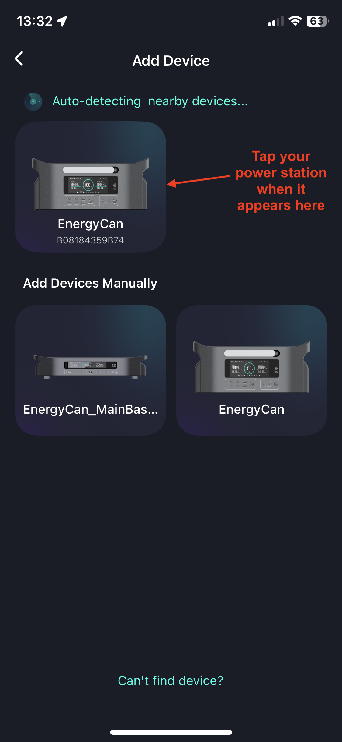 - The Energy Keeper app will detect your power station and show it on the "Add Device" screen, after a few seconds. Tap the picture of the power station (in the app) when it appears.