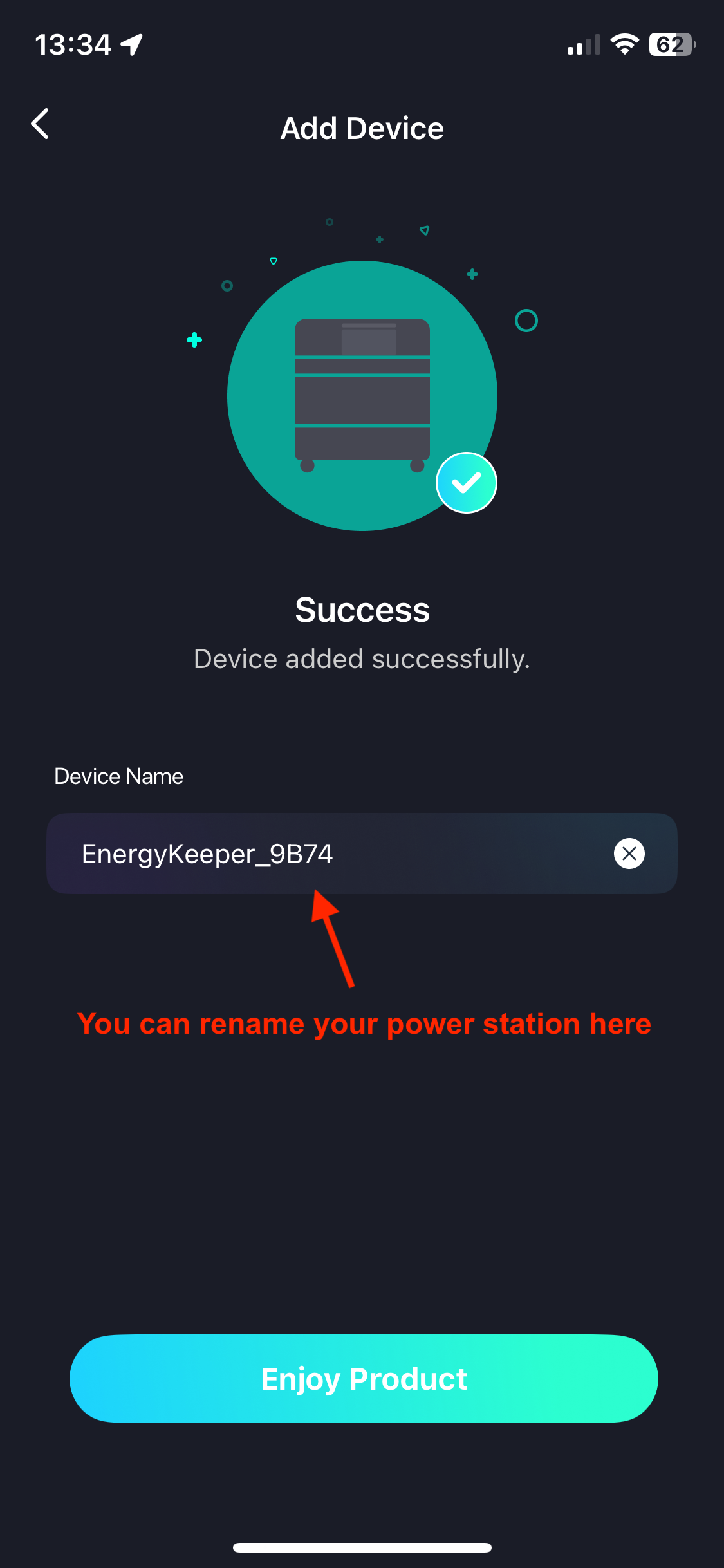 Once the Sorein Power Station is connected to WiFi, you can choose to give your power station a custom name, and begin using the Energy Keeper app. Tap "Enjoy product" to continue.