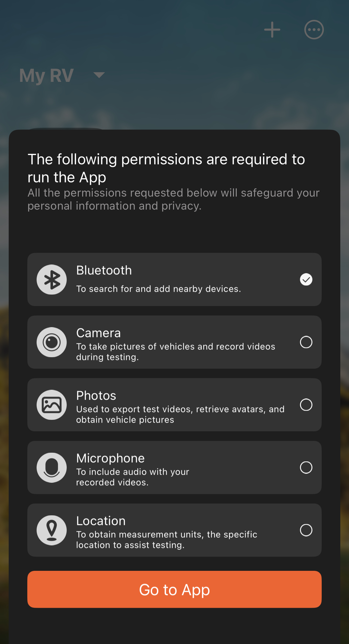 To use the Xparkle leveler, you only have to enable Bluetooth. You can decline all of the other permission requests, and then touch the orange "Go to app" button.
